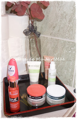 os produtos que uso de rosto estão num tabuleiro arrumados e sem confusões..